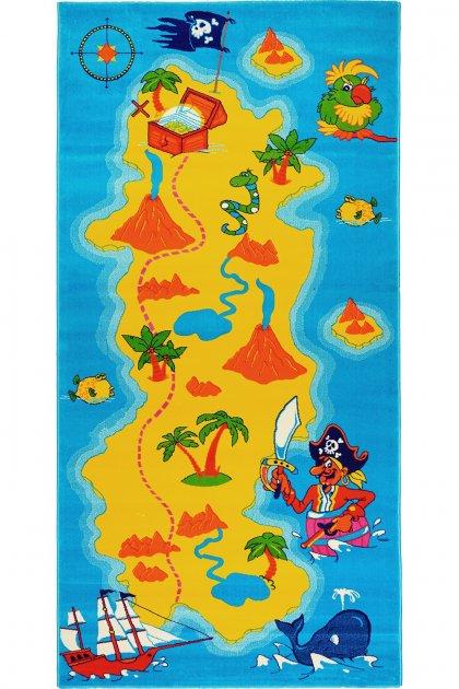 Цей дитячий килим зображує яскраву піратську карту скарбів на жовтому острові, оточеному синім морем. На килимі зображені різні елементи, пов'язані з піратською тематикою: скриня зі скарбами, пірат із шаблею, пальми, вулкани, змія, папуга, риба-фугу та піратський корабель. Червона пунктирна лінія показує шлях до скарбу. Килим призначений для дитячої кімнати або ігрової зони, додаючи пригодницький настрій та стимулюючи уяву дітей.